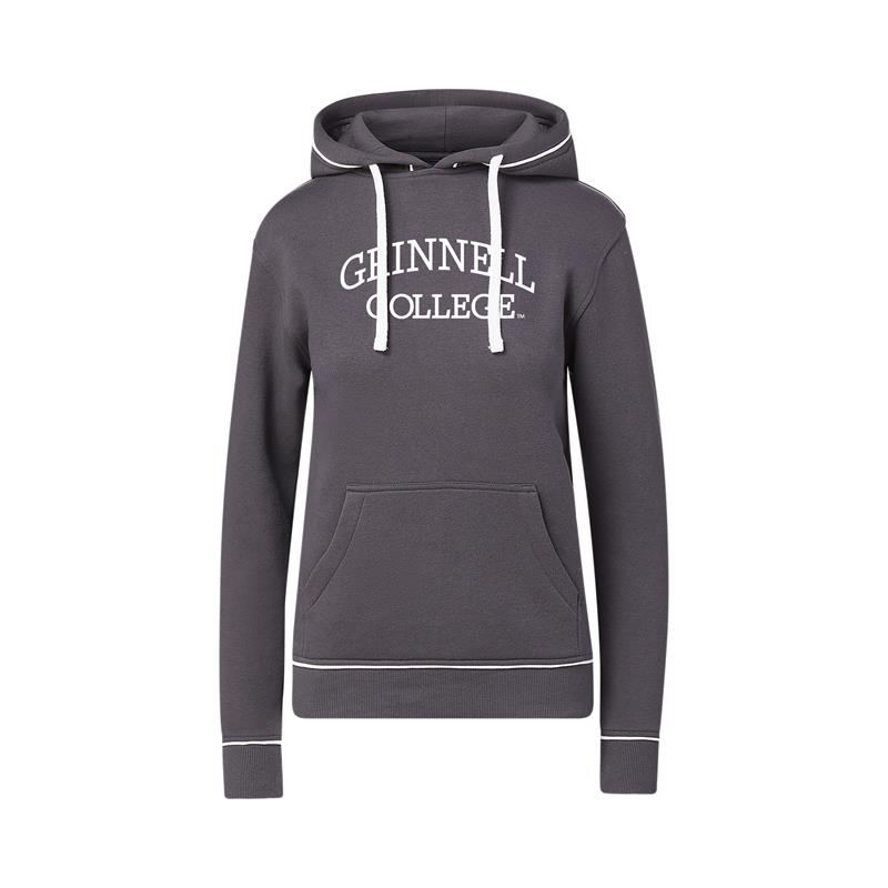 Ladies hooded sweatshirt in gray or red with white piping accents. 55% cotton/45% polyester. Decorated with white ink screenprint. Imported by MVSport