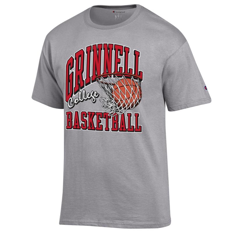 Heather gray jersey T-shirt. 90% cotton/10% polyester. Action basketball through the hoop. Imported by Chamipon